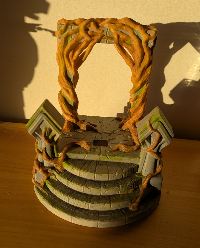 Support de téléphone fantasy imprimé en 3D, design piédestal magique avec pierres et lianes peint à la main. Pratique et décoratif.