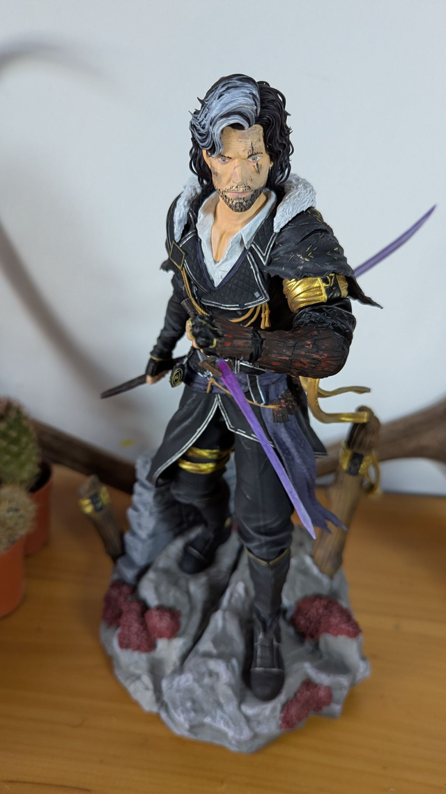 Vêtu d’un manteau sombre aux détails dorés, souligné de textures et de contrastes subtils, le personnage porte en lui toute la tension du clair-obscur : la noblesse et la fatigue, la force et la fragilité. La touche de violet de son arme ajoute une note mystique, symbole d’un pouvoir à la fois maîtrisé et dangereux.
