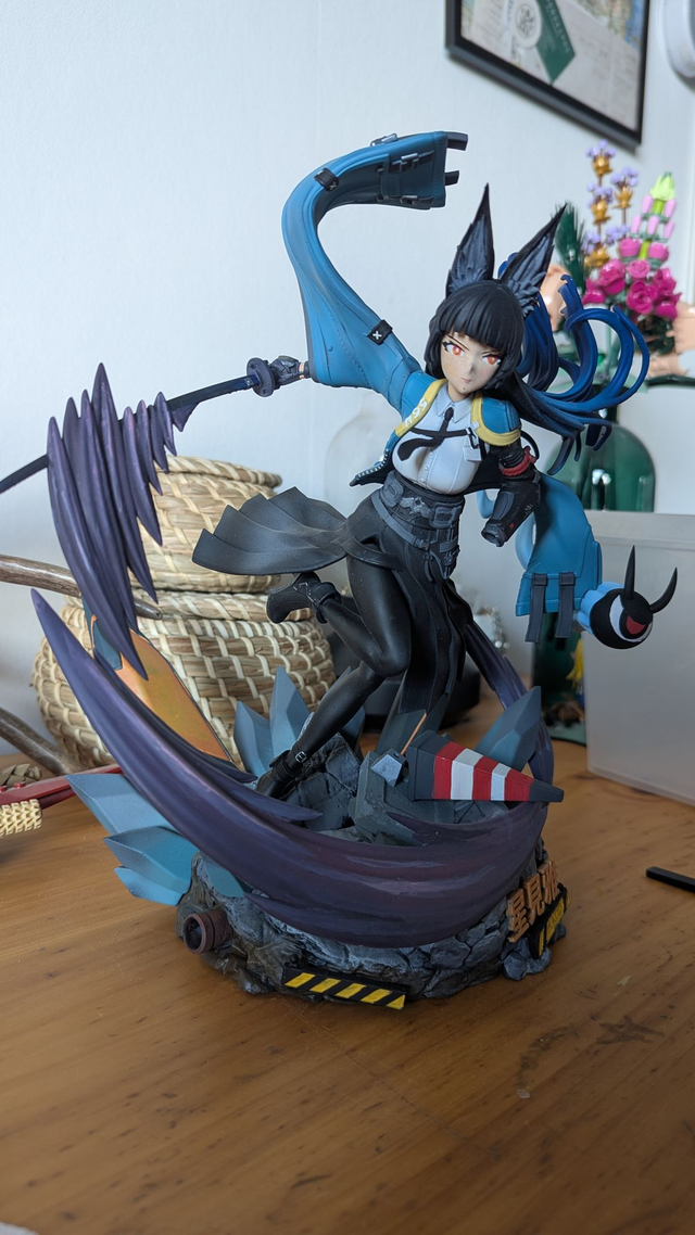 Les dégradés intenses de sa chevelure bleue, ses oreilles animales caractéristiques et son arme longiligne donnent à cette pièce un équilibre parfait entre force et grâce.